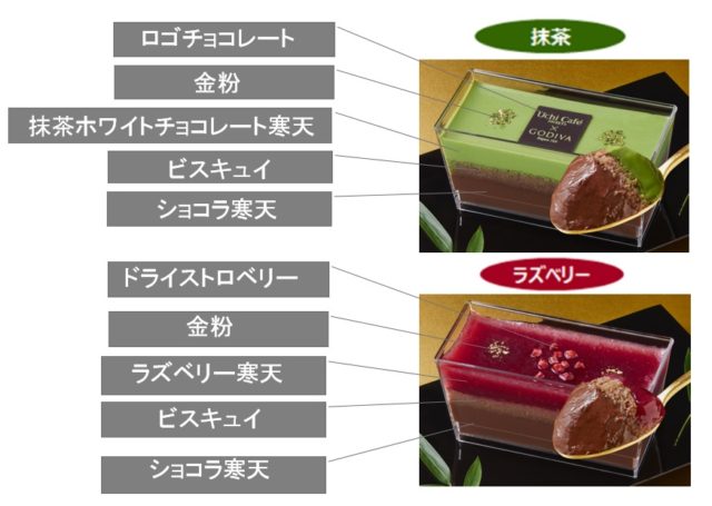日本の夏の風物詩「七夕」をテーマとして、和のテイストを盛り込んだ新感覚のショコラスイーツで、まろやかで香り豊かな抹茶ホワイトチョコレート寒天と、甘酸っぱくみずみずしいラズベリー寒天、2つのテイストをセットにした鮮やかなデザートです。ムースのようになめらかな舌ざわりのショコラ寒天の上にしっとりとしたビスキュイを重ね、3層に仕立てられています。寒天の冷たくさっぱりとした口当たりの中に、カカオの香り高いチョコレートがしっかりと感じられるようになっています。天面には、星空・天の川をイメージした金粉をのせ、それぞれにロゴチョコレート・ドライストロベリーを飾りつけて仕上げました。また、同商品は両社の共同開発商品の中で最高価格となっています。