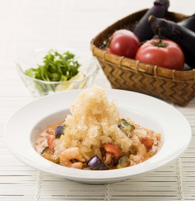 唐辛子の効いた冷製アラビアータの上に、トマトかき氷をトッピング。唐辛子スナックを振りかけて、刺激的な辛みに旨みをプラス。見た目は赤一色、夏はやっぱり辛いもの、冷製ピリ辛パスタ。