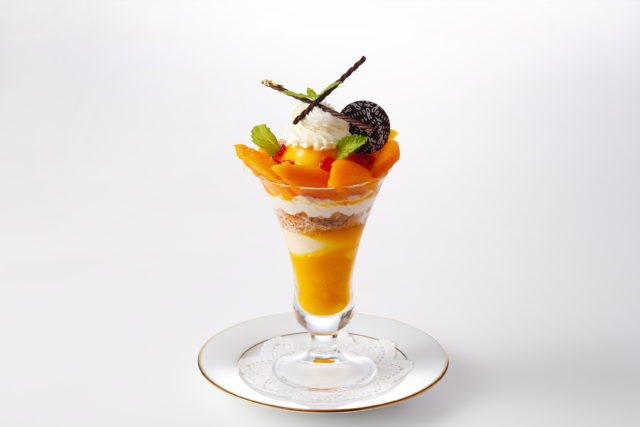甘くて濃厚な宮崎県産の完熟マンゴーを贅沢に盛り付け、マンゴーとパッションフルーツのシャーベットやアロエ、ミルクアイスクリーム、マンゴーソースなどで仕立てた。上に飾った赤すぐりのゼリーとロイヤルティーヌで食感も楽しめるパフェとなっている。