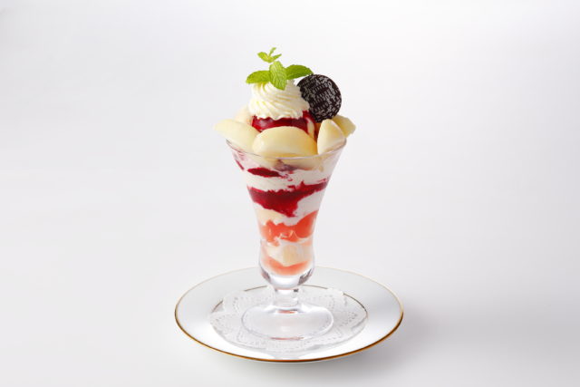 和歌山を代表するブランド桃“あらかわの桃”を出荷ぎりぎりまで収穫せず甘味を増した完熟の状態でパフェに盛り付けた。やさしい甘さの桃の美味しさが引き立つようにミルクアイスクリームと組み合わせ、桃のソルベやソースで仕立てている。