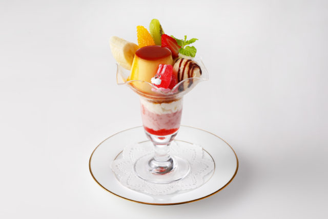 いちご風味のヨーグルトソースをベースにプリンやフルーツ、生クリーム、かわいいマスコットを盛り付けた。サクサクとした食感も楽しめめるパフェとなっている。