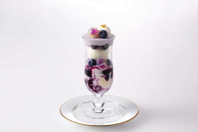 粒が大きく甘みがあるのが特長の山梨県明野産ブルーベリーをそのまま贅沢に使った。ラベンダーの香るはちみつのクレームブリュレやヨーグルトシャーベット&ソース、さらにブルーベリーのゼリー、ソース、クリームなどが奏でる爽やかな味わいの大人パフェとなっている。エディブル・フラワーを包んだレモンゼリーが涼やかでキュート。