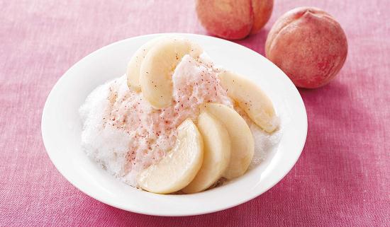 贅沢にまるごと1個分を味わう桃の果実と、オーダーごとにミキシングするフレッシュな桃のソースからは芳醇な香りが広がる。純氷を使用したふわふわ食感のかき氷と、桃の果実のなめらかさ、華やかな香りを楽しむ、特別デザートとなっている。