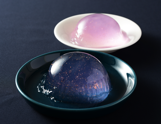 黒トレーを外すと色が変化したように見える不思議なゼリー。ハーブティー「バタフライピーティー」にレモンを加えたことでピンクのような薄紫色に変わった水ゼリーとなっている。中には金粉を入れた。