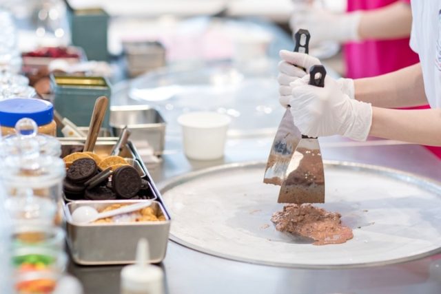 ベースのアイスクリームを選び、スイーツやフルーツを混ぜ込み、ヘラでくるくるっと巻きながら仕上げていく工程が、楽しくて不思議な新しいスタイルのアイスクリームとなっている。