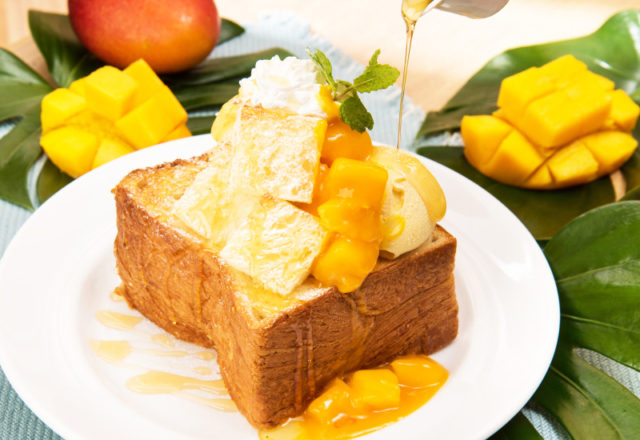 「CAFE & BAKERY MIYABI(カフェ&ベーカリー ミヤビ)」の人気スイーツといえば、「MIYABI(ミヤビ)」を1/2斤使用した「ハニートースト」。その斤量をきっちり守りつつ高級マンゴーのアルフォンスマンゴーをふんだんに加えたフォトジェニックな『マンゴーハニートースト』も初登場。ふわふわサクサクにトーストしたミヤビにひんやり冷たいバニラアイスクリームとマンゴーホイップ、マンゴーの果肉をトッピング。濃厚なマンゴーソースとハチミツをたっぷり加えて提供する。甘さの中にも果実の酸味が感じられ、トロピカルなハーモニーを存分に楽しめる逸品となっている。