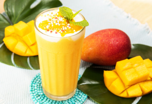“五色あられ”をあしらった、ひんやり冷たいマンゴードリンク