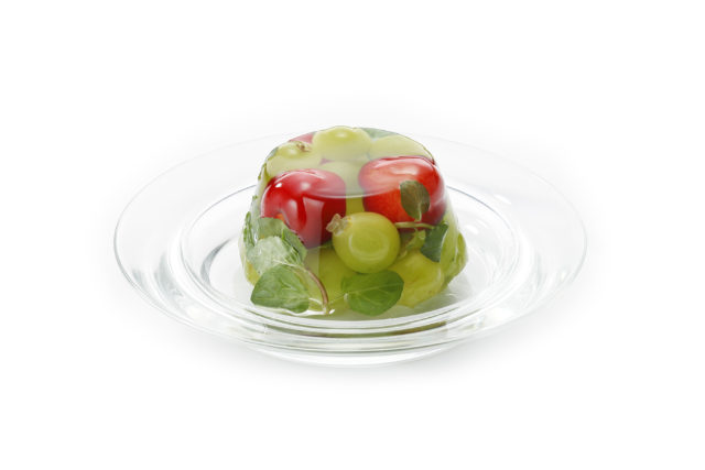 「ジャスミン&マスカット」と水を1:1に希釈し、溶かしたゼラチンを加え良く混ぜる。容器に入れマスカットやチェリーとミントを入れ冷蔵庫で固める。