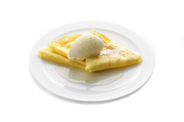クレープを焼き冷ましておく。「グレープフルーツ&レモングラス」をそのまま、クレープにかけバニラアイスをのせる。