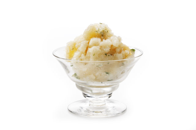 「ローズヒップレモネード」と水を1:1に希釈し、容器にうつし、刻んだミントを入れ冷凍庫で凍らせる。食べる時にスプーンで削って器に盛る。
