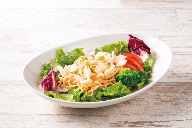 商品説明:人気の明太子ソースをベースにイカをたっぷりトッピングした爽やかな冷製スパゲティ。野菜も摂れるヘルシーなサラダ風の仕立て。