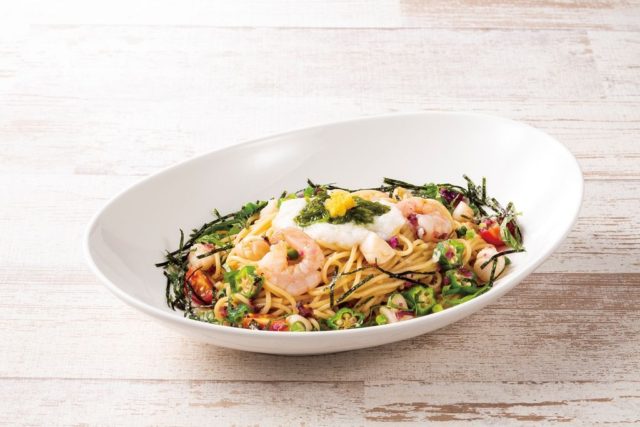 商品説明:「和」をテーマに、身体に良いとされ女性にも人気のネバネバ食材(とろろ、オクラ、めかぶ)を使用した、生姜風味の冷製スパゲティ。