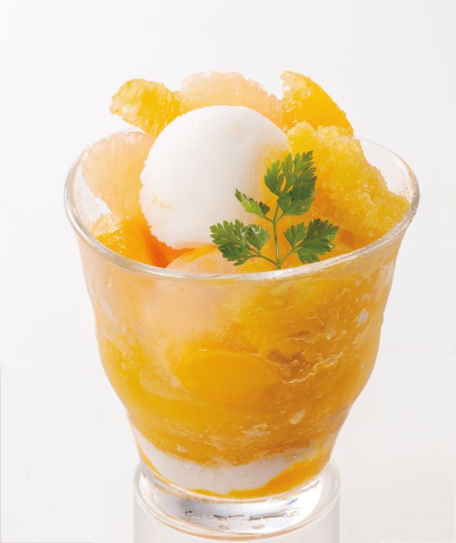 商品説明:店内仕込みのマンゴー風味のグラニテに、フルーツと季節のシャーベット(マンゴー・グレープフルーツ)を飾った爽やかなグラスデザート。