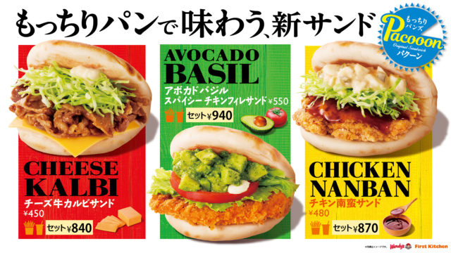 ファーストキッチン株式会社では、7月19日(木)よりファーストキッチンで人気のオリジナル商品「もっちりパン」を使った「パクーン」を、内容も新たに、ウェンディーズ・ファーストキッチンで販売します。今夏は”チーズ牛カルビサンド”、”アボカドバジルスパイシーチキンフィレサンド”、”チキン南蛮サンド” の3種を用意します。