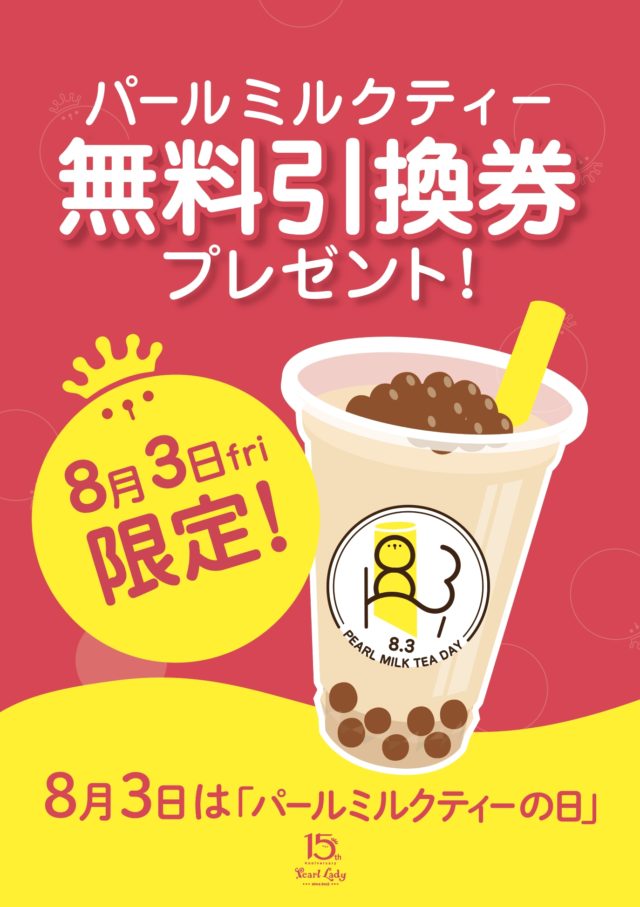 今年15周年を迎えるタピオカドリンク専門店のパールレディ全店で、8月3日は「パールミルクティーの日」にちなんで、タピオカドリンク専門店パールレディ・スイーツパールレディ全店でお得なキャンペーンを実施します。