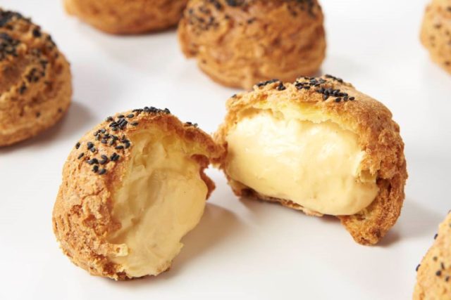 芳ばしい黒ごまがアクセント、カリッと焼き上げたシュー生地に特製クリームをすき間なく、たっぷり詰めたずっしり重みのある贅沢なシュークリームです。