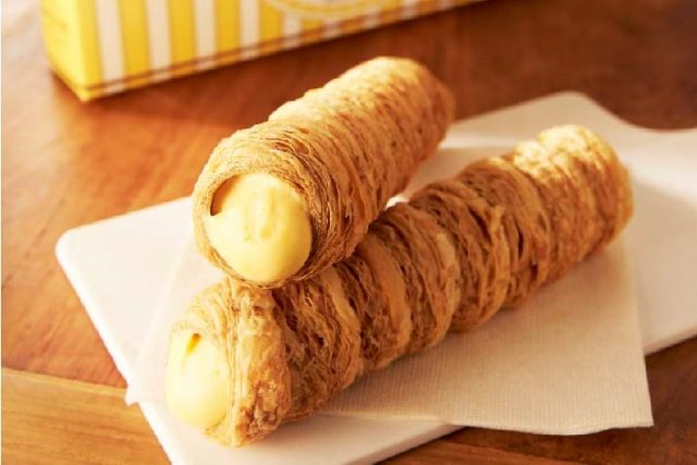 丸の内という土地柄に合わせて、移動車内やオフィス内でのおやつ、観光中の食べ歩きなど、気軽に食べられるように開発しました。シュー生地の代わりにパイ生地を用い、筒状に焼き上げたパイの中に特製クリームをたっぷり絞りました。優しいクリームの甘さとパイの食感がクセになる味わいと、約15㎝と食べ応えのあるボリューム感、片手で手を汚さずに食べられる気軽さが魅力の看板商品です。