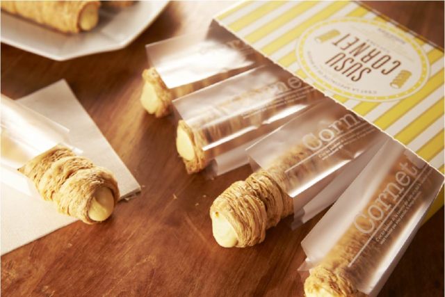 「シュシュコルネ」 は、特製カスタードクリームをたっぷり詰めたスティック状のパイ菓子です。「セブン&アイHLDGS.専門店会業種別個店売上全国1位」※1を誇る、グランツリー武蔵小杉店で1日に平均200個売れている大人気のシュークリームで使用している特製カスタードクリームを使用。