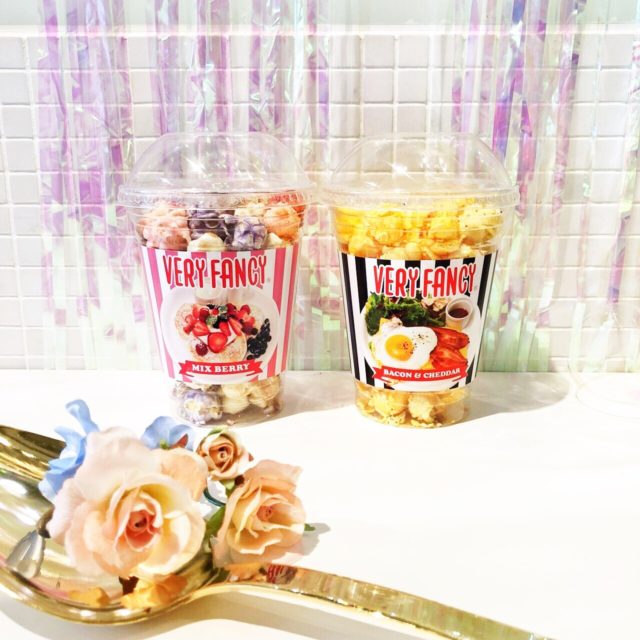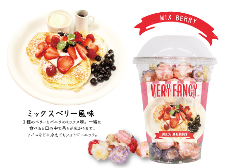 パンケーキ店として話題のVERY FANCYで人気の味「ミックスベリー味」と「ベーコンチェダー味」をリアルに再現し、味にこだわったグルメポップコーンとなります。