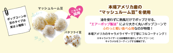 油を使わずに熱風だけでポップさせる“エアーポップ製法”により大きく丸いポップコーンで、ふわっと軽い食べ心地なのが特徴!本場アメリカのキャラメライザーで丁寧にフルコーティングしています。