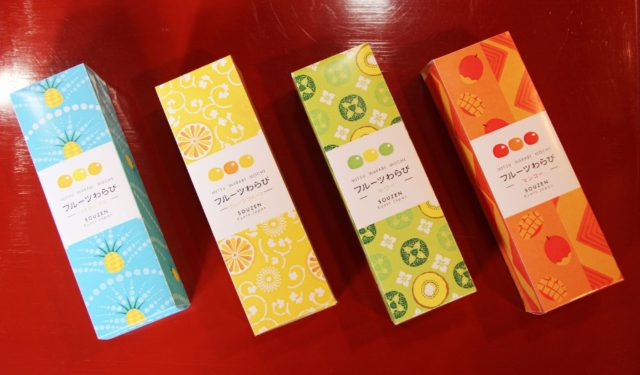フルーツわらびは、わらび餅生地にマンゴーやグレープフルーツの果肉やピューレを煉り込み、さらにフルーツの濃厚さを味わっていただくため、フルーツの特製果汁をわらび餅生地で包み込むという今までにない製法に挑戦しました。