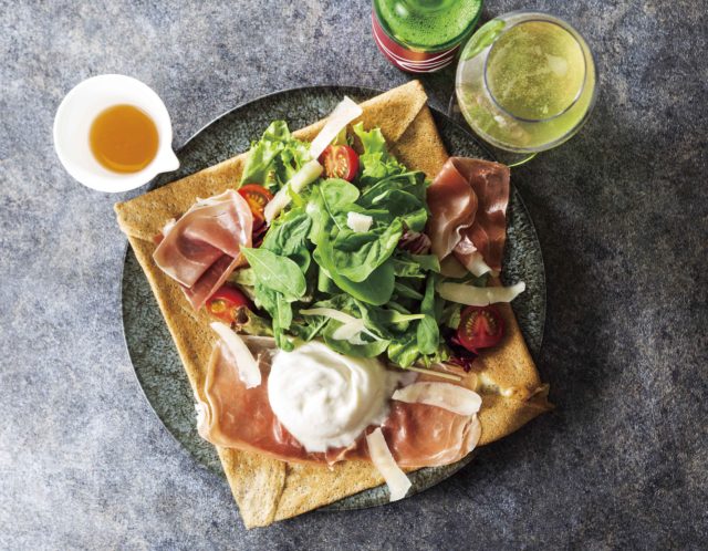 今回、こだわりのスイーツはもちろん、食事メニューがさらに充実しました。人気のガレットには、フレッシュチーズ「ブラータ」と生ハムを使用したメニューが登場。シードルとあわせてお召し上がりいただくのがおすすめです。