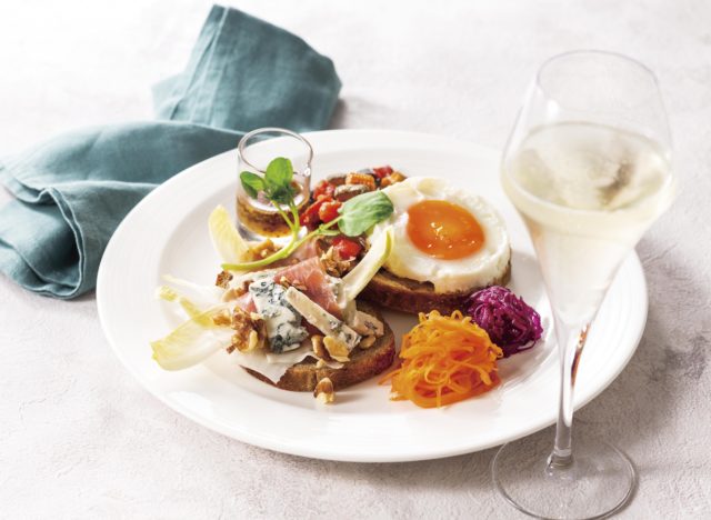 「ワインに合うサンドイッチ」がコンセプト。ライ麦を使用した味わい深いパンに、ラタトゥイユと目玉焼き、生ハムとゴルゴンゾーラチーズをのせました。別添えのハニーマスタードソースで、味わいにアクセントをつけても。