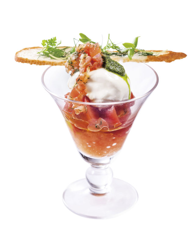 ブラータ、フルーツトマト、トマトのジュレをパフェ仕立ての前菜に。ブラータは、細かくカットしたモッツァレラと生クリームを、モッツァレラで包み込んだフレッシュチーズ。とろっとしたチーズの食感とミルク感、トマトとのマリアージュをお楽しみください。