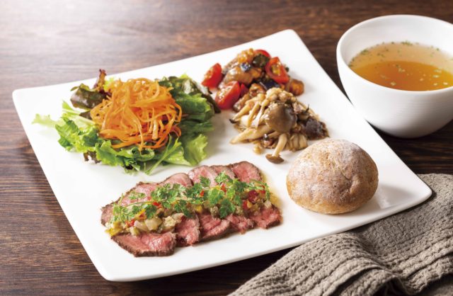 熊本県産赤牛もも肉を使った、やわらかい肉質のローストビーフ。香味野菜を使った特製ラヴィゴットソース*をあわせました。サラダや副菜も充実した欲張りなランチプレートです。