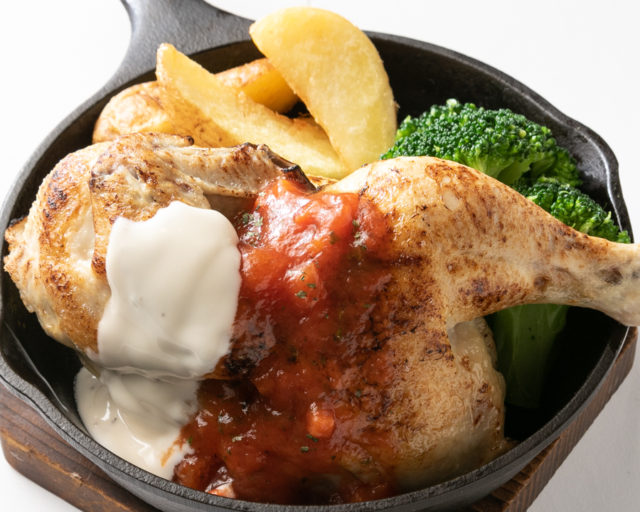 豪快な酔っ払い鶏の半身焼きは当店の看板メニュー。味付けもトマトチーズやデミグラスなど選べてみんなで楽しめます。