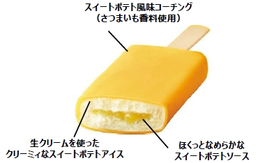 2. 生クリームを使用したクリーミィなスイートポテトアイスの中に、ほくっとなめらかな食感のスイートポテトソースを入れ、スイートポテト風味のコーチング(さつまいも香料使用)で包みこんだ3層仕立てとなっています。