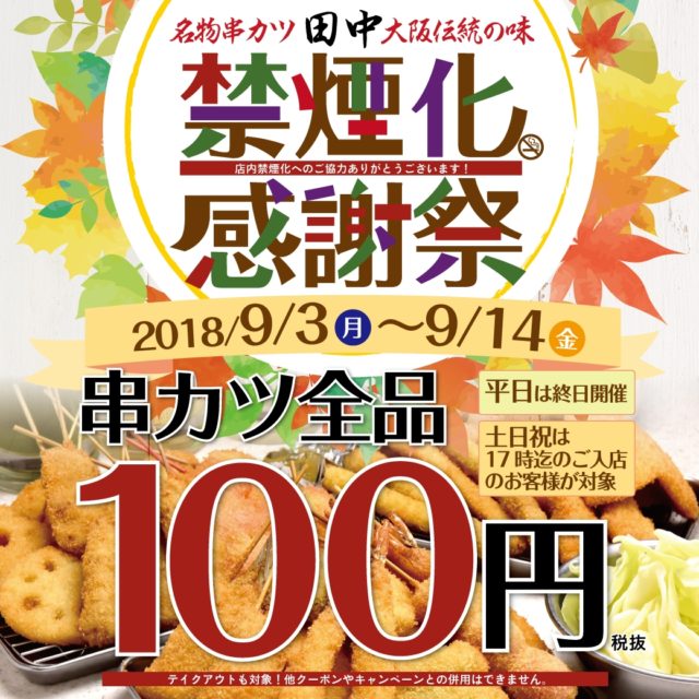 串カツ田中は改正健康増進法成立に先行して2018年6月1日から、大衆酒場ではありますが「お子様を大事にする長期的な経営方針」に則り、ほぼ全店を全席禁煙化しました。禁煙化に伴い、常連客や喫煙のお客、そして地域の人から甚大な協力を得ました。その感謝の気持ちをこめて今回のキャンペーンを実施します。