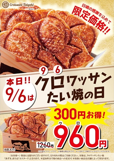 銀のあんを展開する株式会社ホットランドは、2018年9月6日(木)に『クロワッサンたい焼の日』を記念し、全国の銀のあん全店(一部店舗除く)で6匹入りセットの商品を、「クロ(96)ワッサン」にちなみ1箱6匹入り960円(税込)(通常1,260円(税込))の特別価格で販売します。