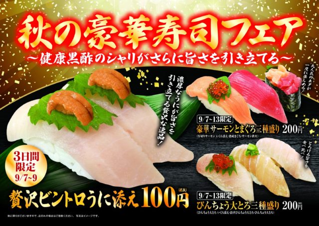 「贅沢&豪華」をテーマにした同フェアは、濃厚なうにをふんだんに使用した「贅沢ビントロうに添え」、大人気ネタのサーモンとまぐろが一度に楽しめる「豪華サーモンとまぐろの三種盛り」、脂の乗ったビンチョウマグロの食べ比べができる「びんちょう大とろ三種盛り」が登場します。