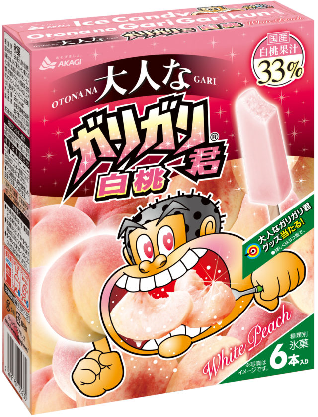 白桃味のアイスキャンディーに、ガリガリ食感のジューシーな白桃味のかき氷を入れたアイスキャンディーとなっています。