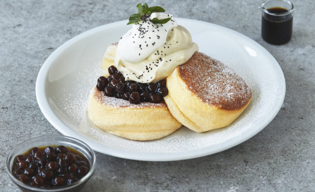 9月3日より発売中の「奇跡のパンケーキ タピオカミルクティー」は、ほんのり香るミルクティークリームにたっぷりのタピオカをトッピングした、食感も楽しい一皿。別添えの黒糖シロップを掛けると、より一層甘みとコクがプラスされた濃厚な味わいのパンケーキを楽しめる商品となっています。