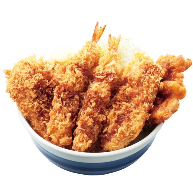 ロースカツ1枚、エビフライ2本、ヒレカツ1枚、から揚げ1個が盛付けられ、満腹になること間違いなしのメニューとなっています。