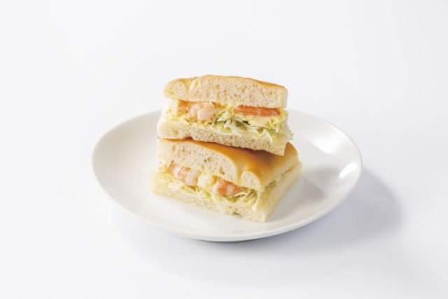 イタリア産のフォカッチャパンにエビとたっぷりキャベツを挟み込んだ、ボリューム感のある断面が食欲をそそるサンドイッチとなっています。