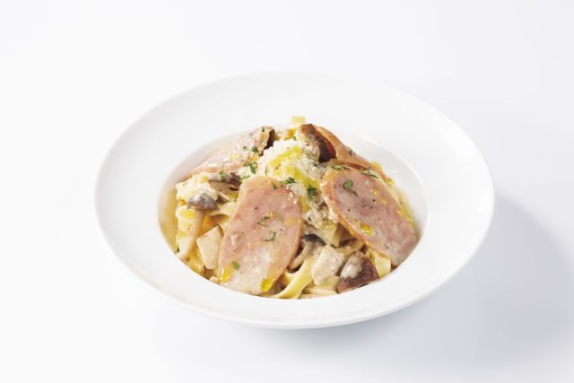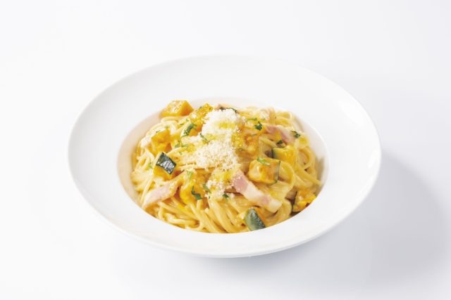 ごろっと感のある北海道産の栗かぼちゃを、ベーコンを加えてコクをプラスしたチーズクリームと合わせた、秋を感じるパスタとなっています。