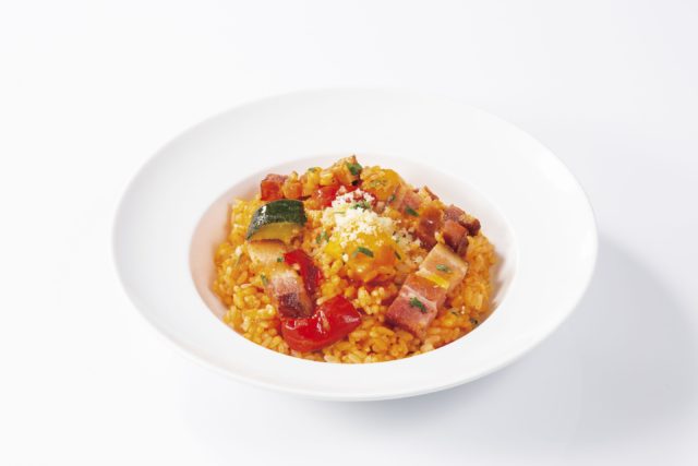 緑黄色野菜とパルミジャーノチーズでうま味を凝縮したソースに、グリルした厚切りベーコンをトッピングしたクリームリゾットとなっています。