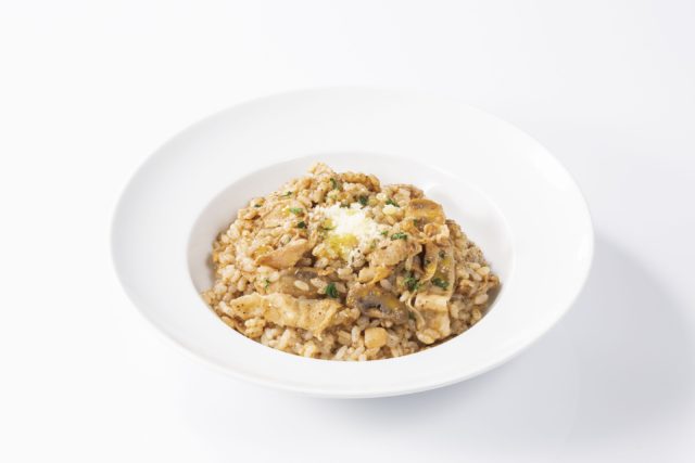 シンプルながらも香り高く奥深い味わいが特徴の、ブラウンマッシュルームソースリゾットとなっています。