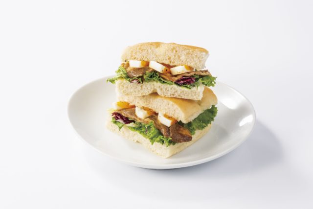 イタリア産のフォカッチャパンに牛カルビとスライスエッグを挟み込んだ、ボリューム感のある断面が食欲をそそるサンドイッチとなっています。