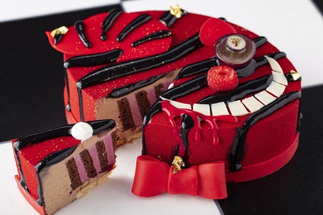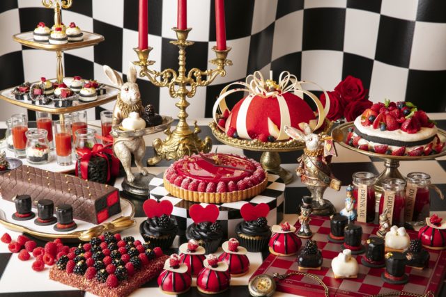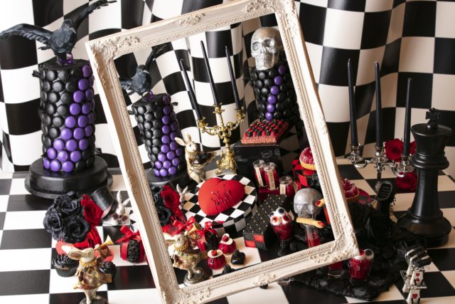 ホテル1階「マーブルラウンジ」で開催されるデザートビュッフェ『アリスinハロウィーン・トリック』では、アリスが迷い込む摩訶不思議なハロウィーン・トリックの世界を表現。ラウンジ全体にトリック・アートとプロジェクションマッピングの演出がされた空間には、赤と黒を基調とした大人可愛いアリスの世界と、骸骨や魔女の家が怪しげにたたずむハロウィーンエリアがユニークに調和。たくさんのトリックが隠された今回のフェアは、まるでスイーツと見間違えるような軽食が登場したり、絵画と思ったらスイーツ!など、シェフによる食のトリックと、今までにない新しい体験型デザートビュッフェとして注目となっています。