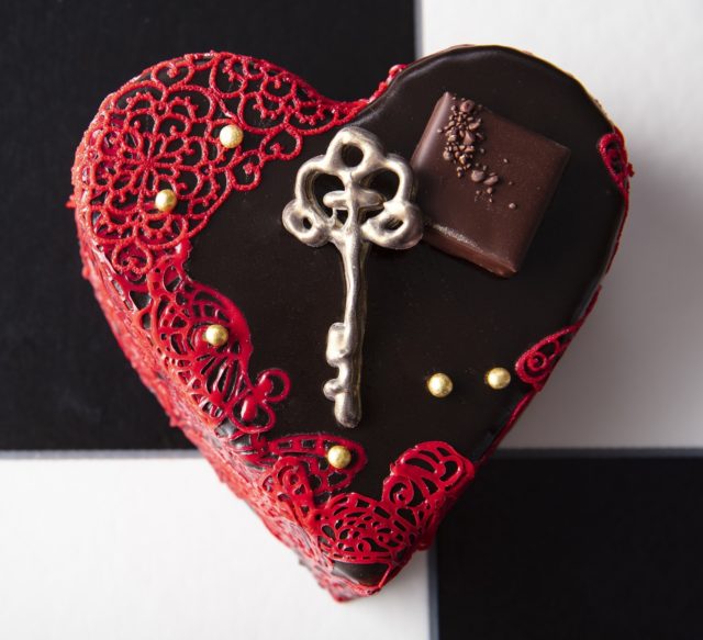 アリスが見つけた鍵をイメージしたハート型のザッハトルテ。甘酸っぱいアプリコットジャムをサンドしたチョコレートケーキ、繊細な赤いレース模様のシュガーペーストに、チョコレートで作る鍵がアクセントとして添えられます。