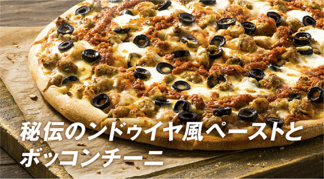 使用材料:ンドゥイヤ風ペースト/イタリア産ボッコンチーニ/ブラックオリーブ/イタリアンソーセージ/トマトソース