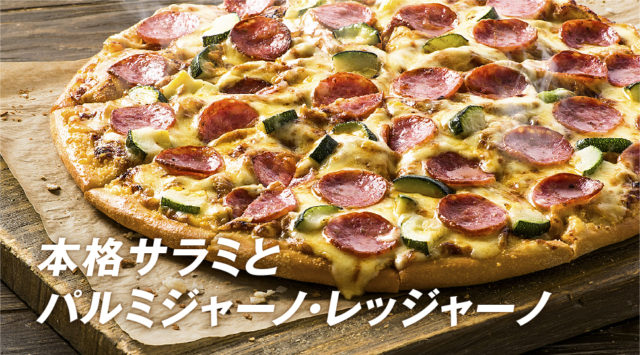 使用材料:本格サラミ/パルミジャーノ・レッジャーノ/芳醇ゴーダ/グリルズッキーニ/特製トマトソース