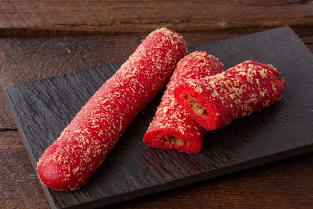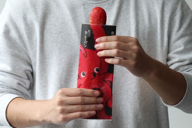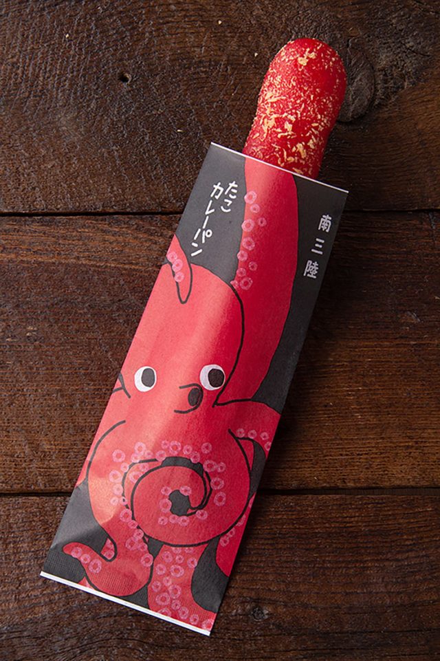 茹でたタコの足を連想させる、インパクトの強い見た目、辛さを抑え、タコのうまみとガーリックの甘みをきかせたマイルドな味のカレーパンに仕上げました。