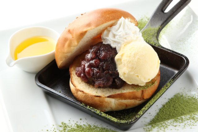 トーストに小倉をのせて食べる名古屋流の食べ方をアメリカのハンバーガーで。