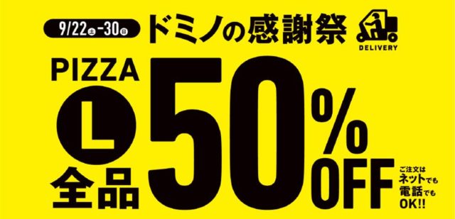 ドミノ・ピザで1番お得なデリバリーキャンペーン「感謝祭」にて、Lサイズピザ全品50%OFFを実施します。今回の感謝祭はネット注文だけではなく、電話での注文も50%OFFに!9月18日(火)から期間限定で発売中の「究極イタリアン」も50%OFFになり、イタリアの希少食材を使用した本格的な味をおトクに楽しめます。シルバーウィークの家族団らんや、ピザをおトクに食べたい方におすすめとなっています。