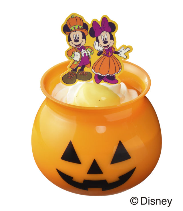ジャック・オ・ランタン形の器に入った、ハロウィン限定プリンです。かぼちゃの甘みとコクがまろやかに広がるプリンの上に、クリームとアングレーズソースをのせました。ミッキー&ミニーのハロウィンピック付きとなっています。
